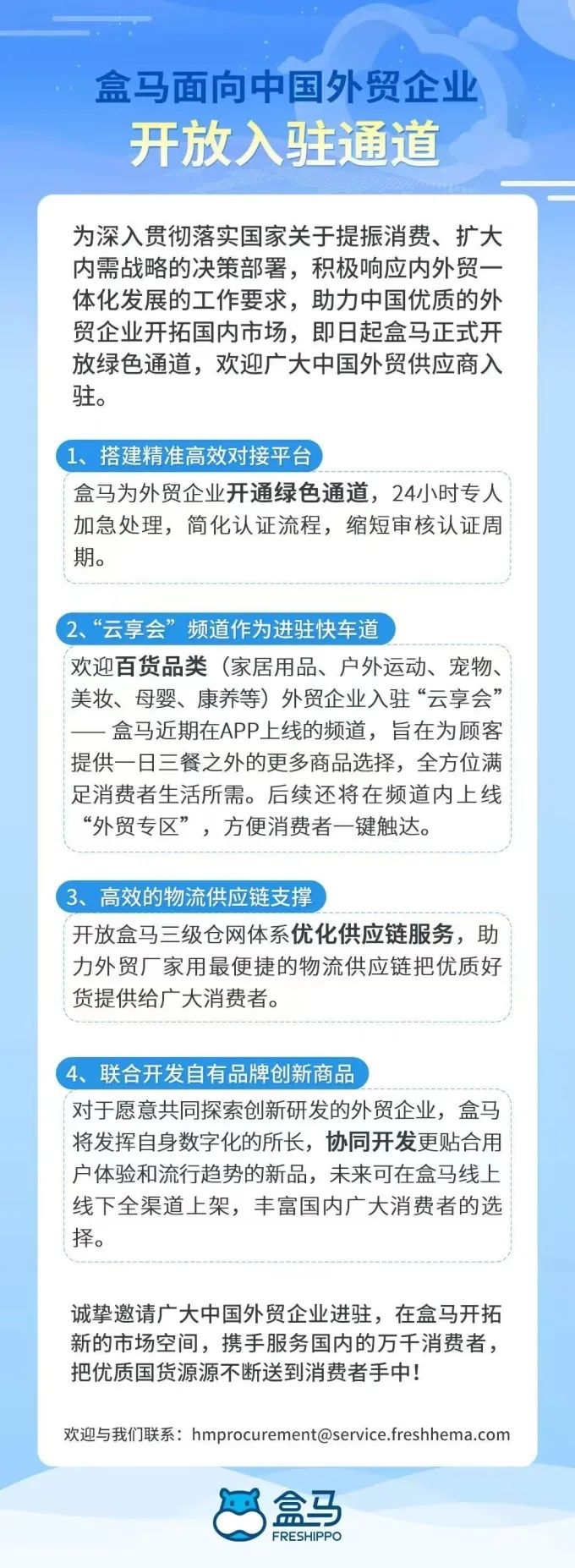 1、搭建精準高效對接平臺。盒馬為外貿(mào)企業(yè)開通綠色通道,24小時專人加急處理,簡化認證流程,縮短審核認證周期。
