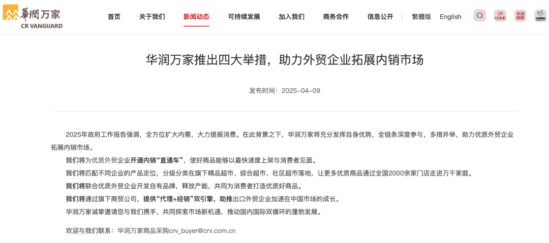 4月9日,華潤萬家推出四大舉措,助力外貿(mào)企業(yè)拓展內(nèi)銷市場。