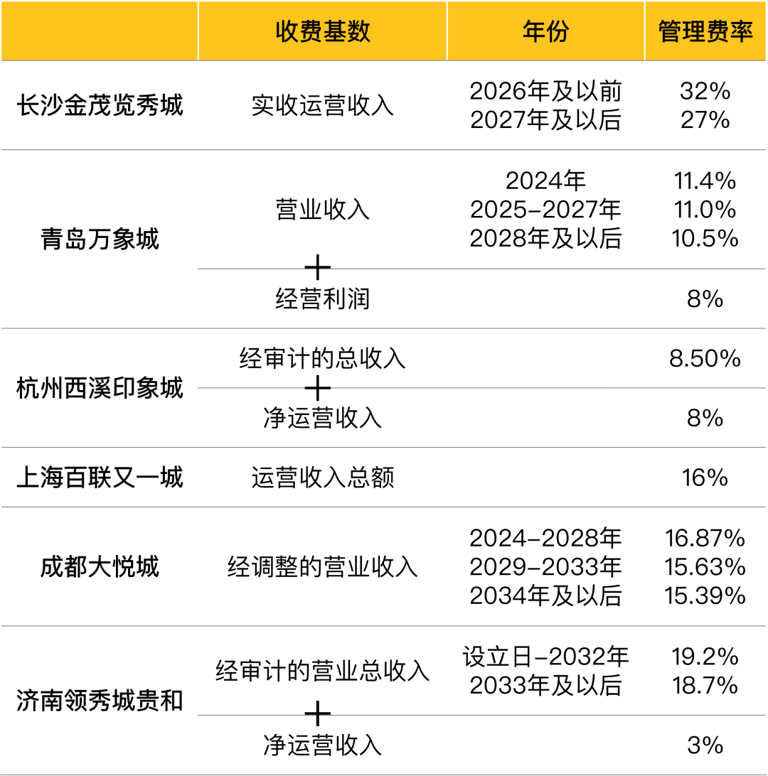 先來說基礎(chǔ)管理費(fèi)。在計(jì)費(fèi)口徑上,大部分項(xiàng)目使用的是營(yíng)業(yè)收入或運(yùn)營(yíng)收入,但杭州西溪印象城和濟(jì)南領(lǐng)秀城貴和使用的是總收入,包括了“營(yíng)業(yè)外收入+其他收益”。