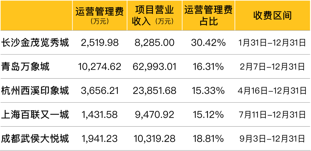 如華潤(rùn)通過對(duì)青島萬象城的管理,近11個(gè)月的時(shí)間收取的運(yùn)營(yíng)管理費(fèi)超過1個(gè)億;而長(zhǎng)沙金茂覽秀城,雖然運(yùn)營(yíng)管理費(fèi)總額不高,但整體占項(xiàng)目營(yíng)業(yè)收入的比例超過了30%。