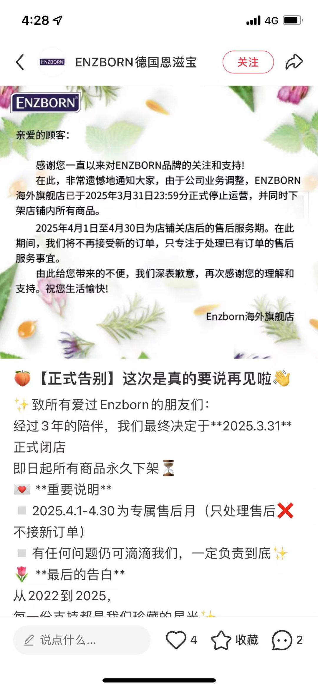 前不久,德國植物天然萃取護理品牌ENZBORN恩滋寶通過小紅書官方賬號宣布,ENZBORN天貓海外旗艦店已于3月31日正式停止運營。