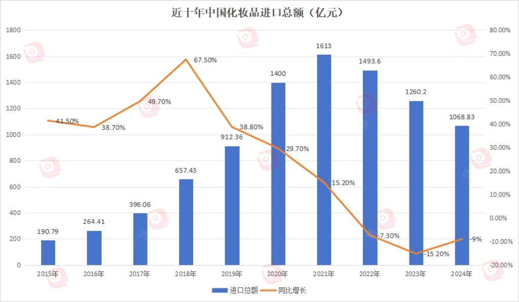 從數(shù)據(jù)上來看,更能夠直觀感受到上述趨勢變化。青眼通過梳理近10年中國化妝品進口總額數(shù)據(jù)發(fā)現(xiàn),2015年至2018年,進口化妝品總額整體呈現(xiàn)出高速增長階段,每年的同比增長率均在38%以上,且在2018年達到了峰值,同比增幅高達67.5%。從2019年開始,進口化妝品總額增速就開始逐步放緩,不過進口總額仍保持增長勢態(tài)。從2022年起,我國開始進入到進口化妝品的“負增長時代”,進口化妝品總額呈現(xiàn)同比下滑。2023年化妝品進口總額更是同比下滑15.2%,創(chuàng)下十年新低。