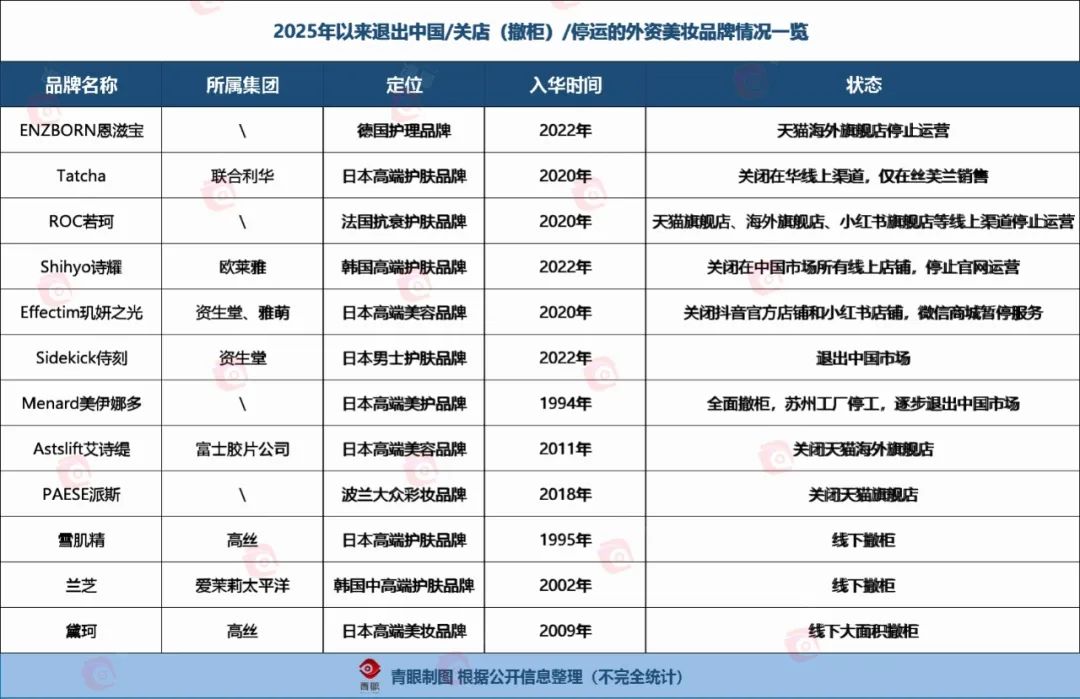 事實上,恩滋寶停運天貓海外旗艦店僅是外資美妝品牌在華“不吃香”現(xiàn)象的一個縮影。據(jù)青眼不完全統(tǒng)計,今年以來,已至少有12個外資美妝品牌出現(xiàn)退出中國/關店/撤柜的情況。這也反映出,外資美妝在中國“躺贏”的時代已經(jīng)結束。