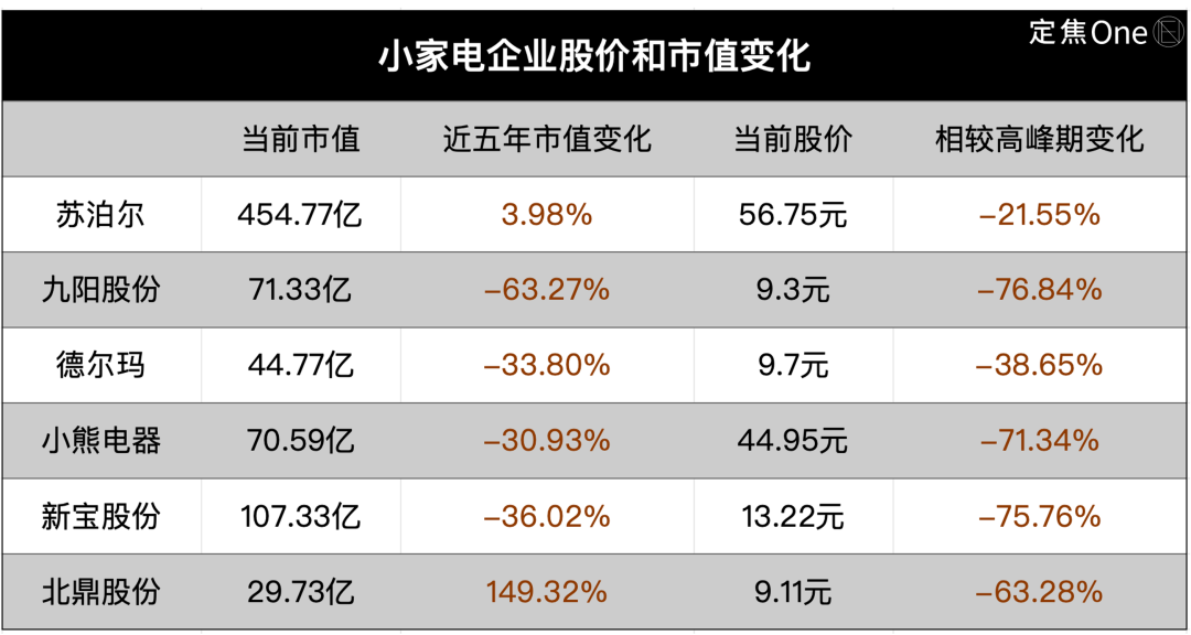 其中既有行業(yè)巨頭蘇泊爾和九陽(yáng),也有網(wǎng)紅小家電品牌小熊電器和北鼎,還有知名代工企業(yè)新寶股份(旗下有摩飛)和德?tīng)柆敚樾∶状ぃ。另外,美的和海爾也是小家電行業(yè)的重磅玩家,但因?yàn)闆](méi)有單獨(dú)披露相關(guān)業(yè)績(jī)數(shù)據(jù),暫時(shí)沒(méi)有列入統(tǒng)計(jì)。