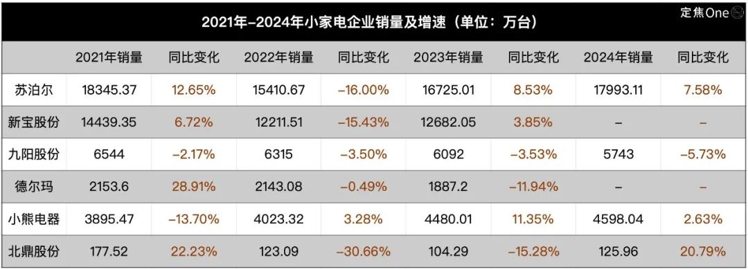到了2023年,在以抖音快手為代表的新型直播電商渠道崛起的背景之下,小熊電器、蘇泊爾、新寶股份等品牌銷量提升,行業(yè)有所回暖。但是九陽(yáng)、德?tīng)柆敽捅倍θ匀惶幱谙禄瑧B(tài)勢(shì)。
