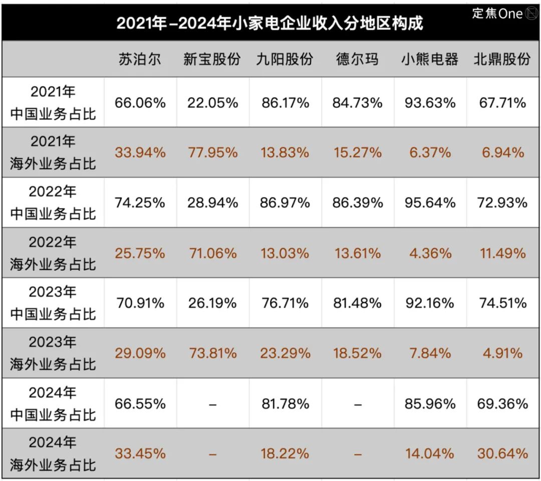 2024年,六家公司中,新寶股份和北鼎股份有超過(guò)10%的營(yíng)收增速,其他四家均呈現(xiàn)漲不動(dòng)或負(fù)增長(zhǎng)的趨勢(shì)。值得注意的是,新寶股份的增速更多也是靠海外代工業(yè)務(wù)拉動(dòng)。