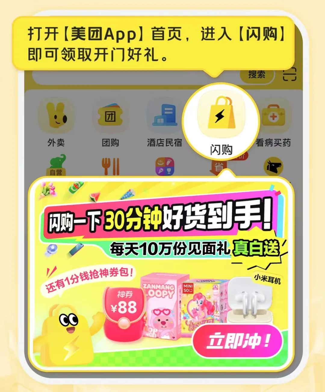 即日起,全國(guó)消費(fèi)者可在美團(tuán)App首頁(yè)進(jìn)入“閃購(gòu)”,選購(gòu)蔬菜水果、酒水飲料、休閑食品、數(shù)碼家電、美妝護(hù)膚、潮流玩具、運(yùn)動(dòng)用品、鮮花綠植、母嬰用品、寵物用品等生活萬(wàn)物,下單后平均30分鐘送達(dá)。美團(tuán)閃購(gòu)將向全國(guó)消費(fèi)者免費(fèi)送出三十萬(wàn)份數(shù)碼家電、日用百貨類(lèi)“開(kāi)門(mén)好禮”,提供1分錢(qián)搶88元神券包福利,同時(shí)將持續(xù)聯(lián)合多家品牌零售商開(kāi)展“超級(jí)大牌日”活動(dòng),發(fā)放最高200元的品牌專(zhuān)屬神券。
