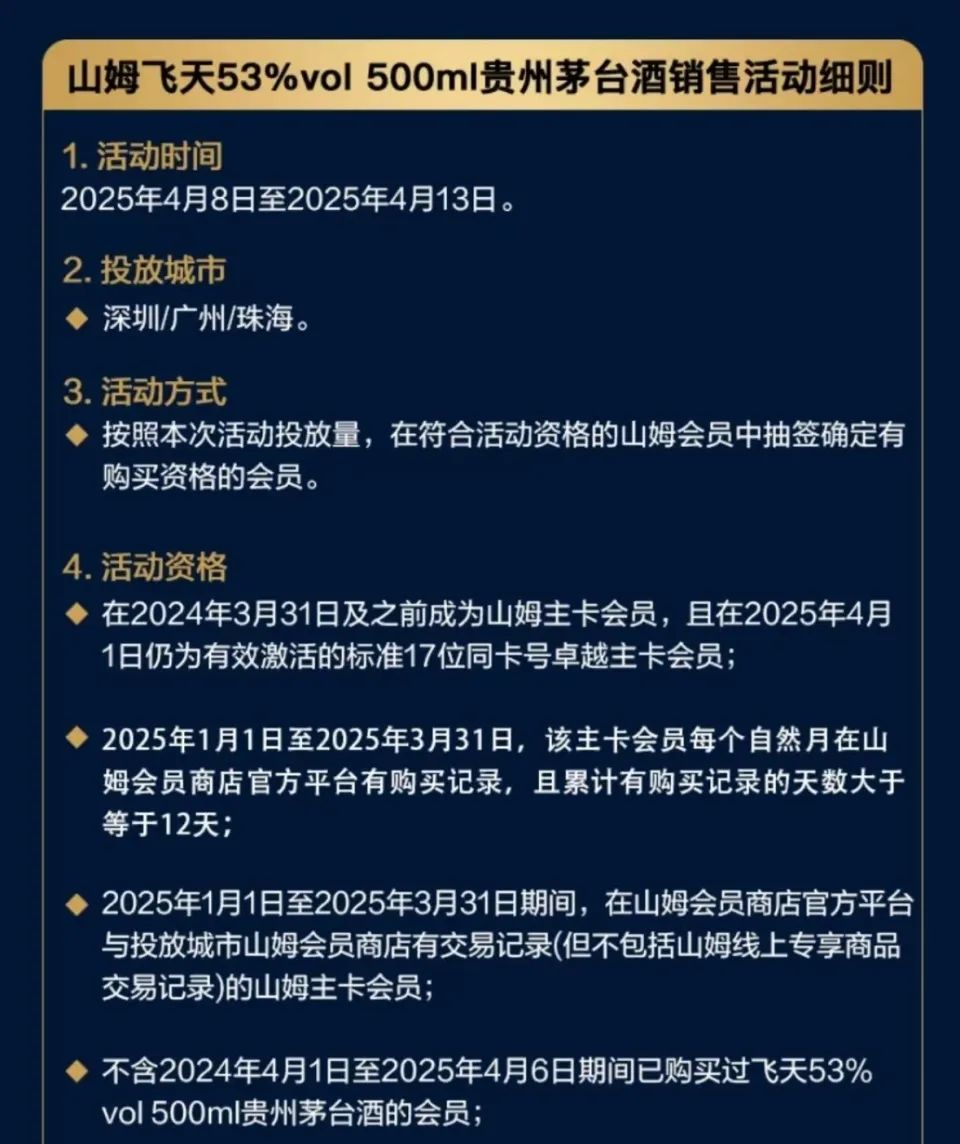 根據(jù)山姆4月的飛天茅臺酒銷售活動細則,需要滿足會員卡等級、消費頻次等多個維度才能獲得參與活動資格。具體包括在2024年3月31日及之前成為山姆主卡會員,且在2025年4月1日仍為有效激活的標(biāo)準(zhǔn)17位同卡號卓越主卡會員;2025年1月1日至2025年3月31日,該主卡會員每個自然月在山姆會員商店官方平臺有購買記錄,且累計有購買記錄的天數(shù)大于等于12天等等。