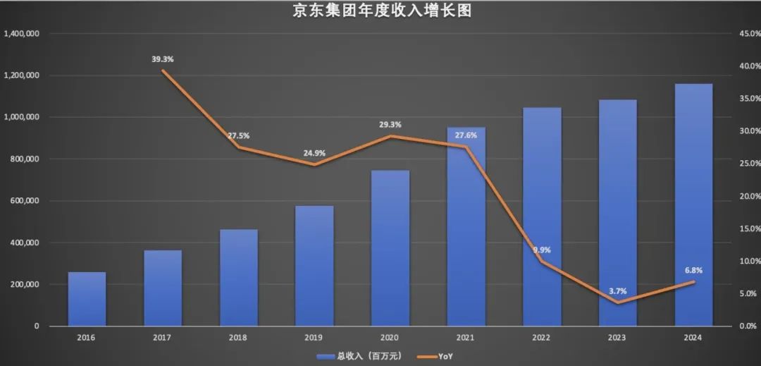 雖然最近三年京東集團凈利潤實現(xiàn)了大幅增長,但營收增速卻明顯放緩。從近八年的財務(wù)數(shù)據(jù)看,京東集團營收增長明顯放緩,2024年度總收入同比增長6.8%,經(jīng)營利潤僅為3.3%。