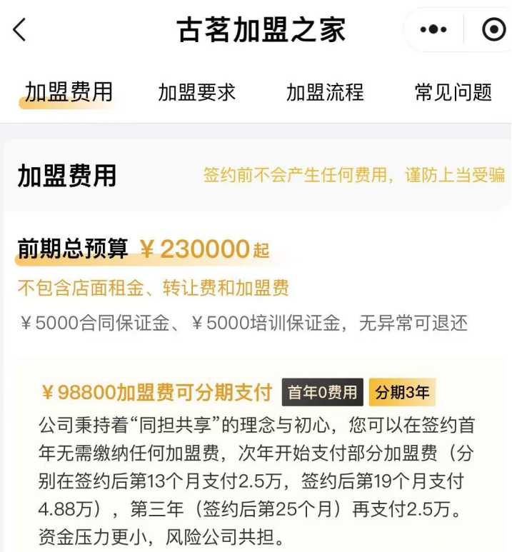同時(shí),考慮到加盟是目前品牌方實(shí)現(xiàn)規(guī)模擴(kuò)展和盈利的核心組成部分之一,為了吸引更多的創(chuàng)業(yè)者加入進(jìn)來,一些品牌方往往也會(huì)絞盡腦汁推出各種極具誘惑力的加盟政策,因?yàn)橛腥诉M(jìn)來錢就賺到手。比如,古茗曾對(duì)加盟商實(shí)行了“0加盟費(fèi)”政策,而后再進(jìn)行逐步收費(fèi),讓加盟商“先賺錢后付費(fèi)”。