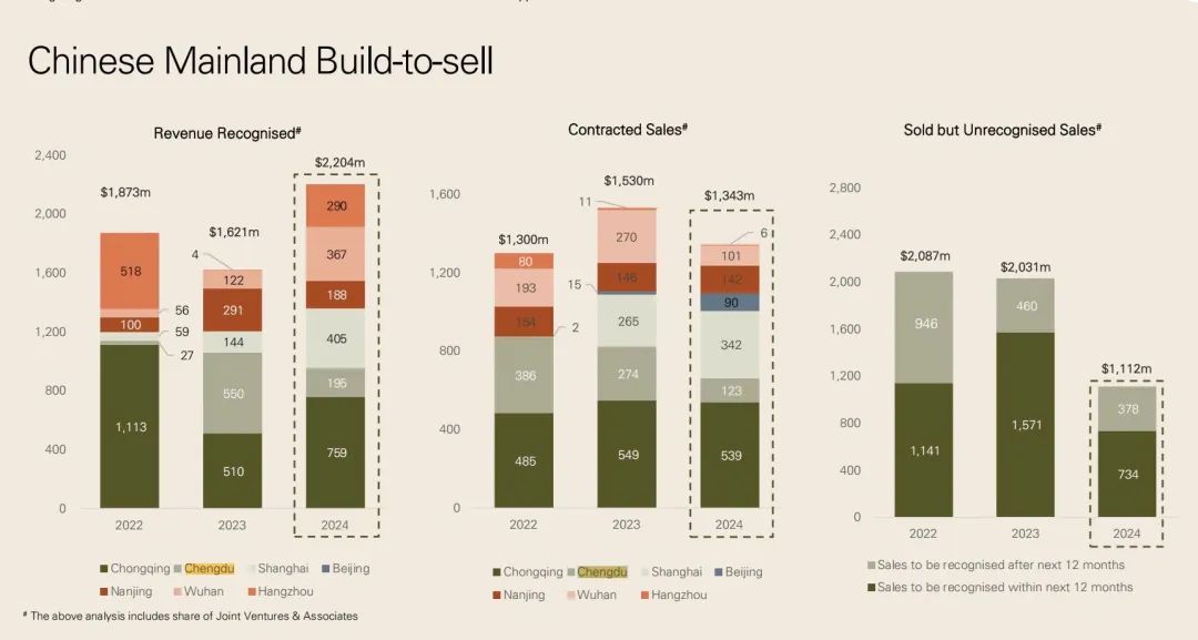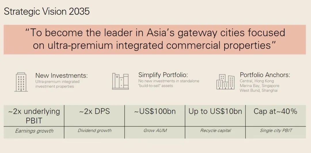 在2035年回收100億美元的長(zhǎng)期計(jì)劃中,年報(bào)透露更多細(xì)節(jié),包括退出非核心業(yè)務(wù),并將成熟資產(chǎn)轉(zhuǎn)向REITs。香港置地2024年已回收超2.9億美元,其中80%用于降低凈債務(wù)與投資核心項(xiàng)目,20%用于股份回購(gòu)。計(jì)劃在2027年前通過資產(chǎn)處置回收40億-60億美元,加速處置Build-to-Sell建售型資產(chǎn)。