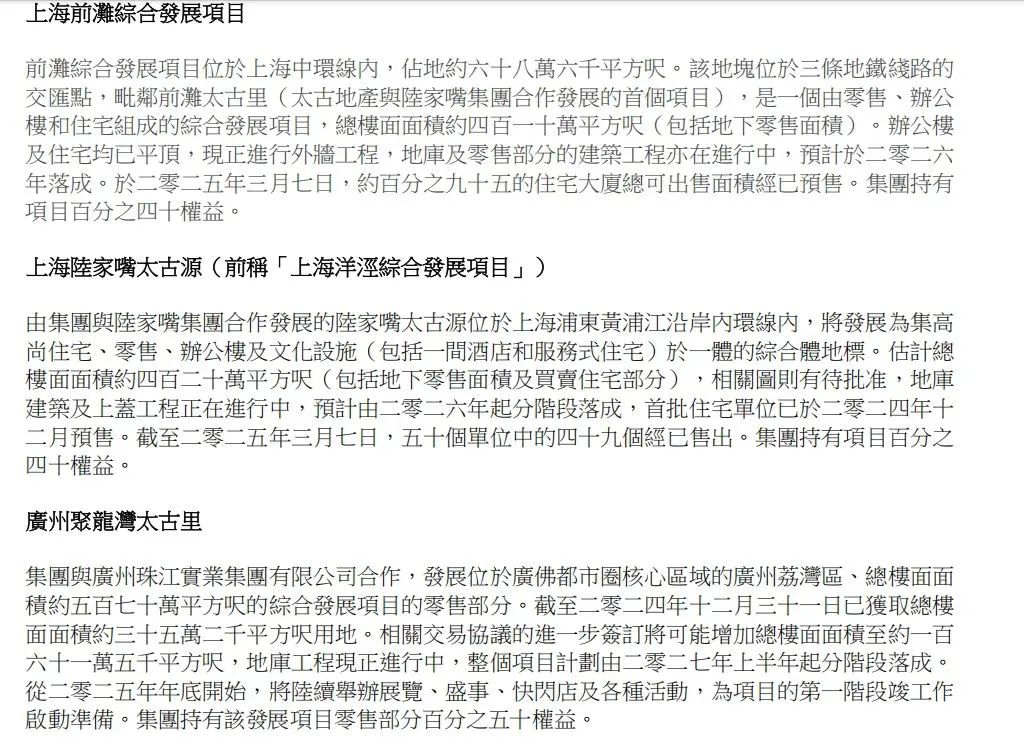 目前,太古在內(nèi)地發(fā)展中項(xiàng)目仍有七個(gè),包括北京太古坊、西安太古里、三亞太古里、廣州聚龍灣太古里、廣州天河路387號(hào)項(xiàng)目廣州太古匯擴(kuò)建部分。其中,與前灘太古里聯(lián)動(dòng)的上海前灘21號(hào)綜合發(fā)展項(xiàng)目計(jì)劃在2026年落成、上海洋涇的陸家嘴太古源將在2026年分階段落成。