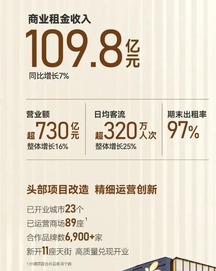 龍湖商業(yè)租金收入同比增長(zhǎng)7%至109.8億元,期末出租率97%。營(yíng)業(yè)額同比增長(zhǎng)16%,超730億元;日均客流超320萬(wàn)人次/天,同比增長(zhǎng)25%。同時(shí),由商業(yè)投資與資產(chǎn)管理航道組成的運(yùn)營(yíng)業(yè)務(wù),全年實(shí)現(xiàn)運(yùn)營(yíng)收入135億元,同比增長(zhǎng)5%。