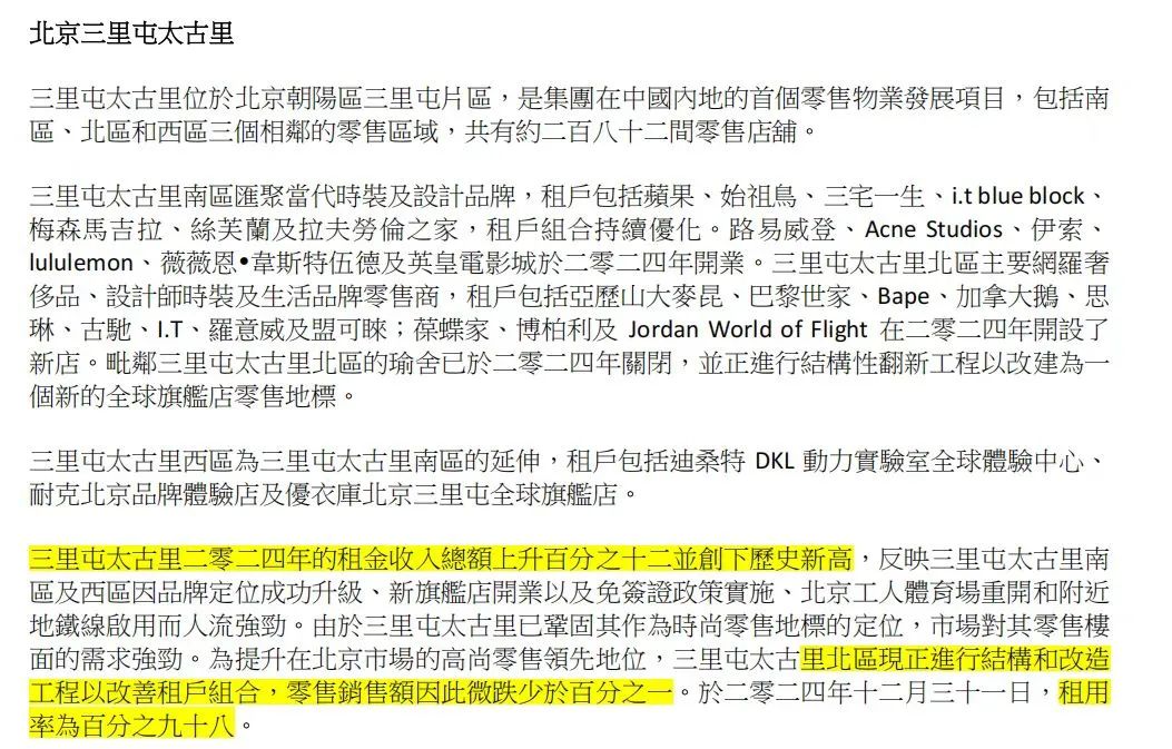 2024年,成都太古里、廣州太古匯、北京頤堤港和上海興業(yè)太古匯分別下跌14%、11%、4%及14%。2024年與2019年相比,三里屯太古里、成都太古里和太古匯的零售銷售額分別上升1%、24%及67%,頤堤港則下跌1%,興業(yè)太古匯因進(jìn)行大型結(jié)構(gòu)和改造工程影響下跌15%。