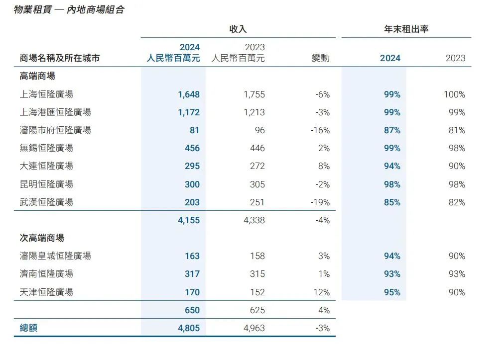 2024年恒隆內(nèi)地業(yè)務(wù)營(yíng)收占比近60%,恒隆2024年內(nèi)地整體租賃收入和營(yíng)業(yè)利潤(rùn)(按人民幣計(jì)值)分別下降4%和6%,其中商場(chǎng)收入下跌3%,辦公樓收入下跌6%。
