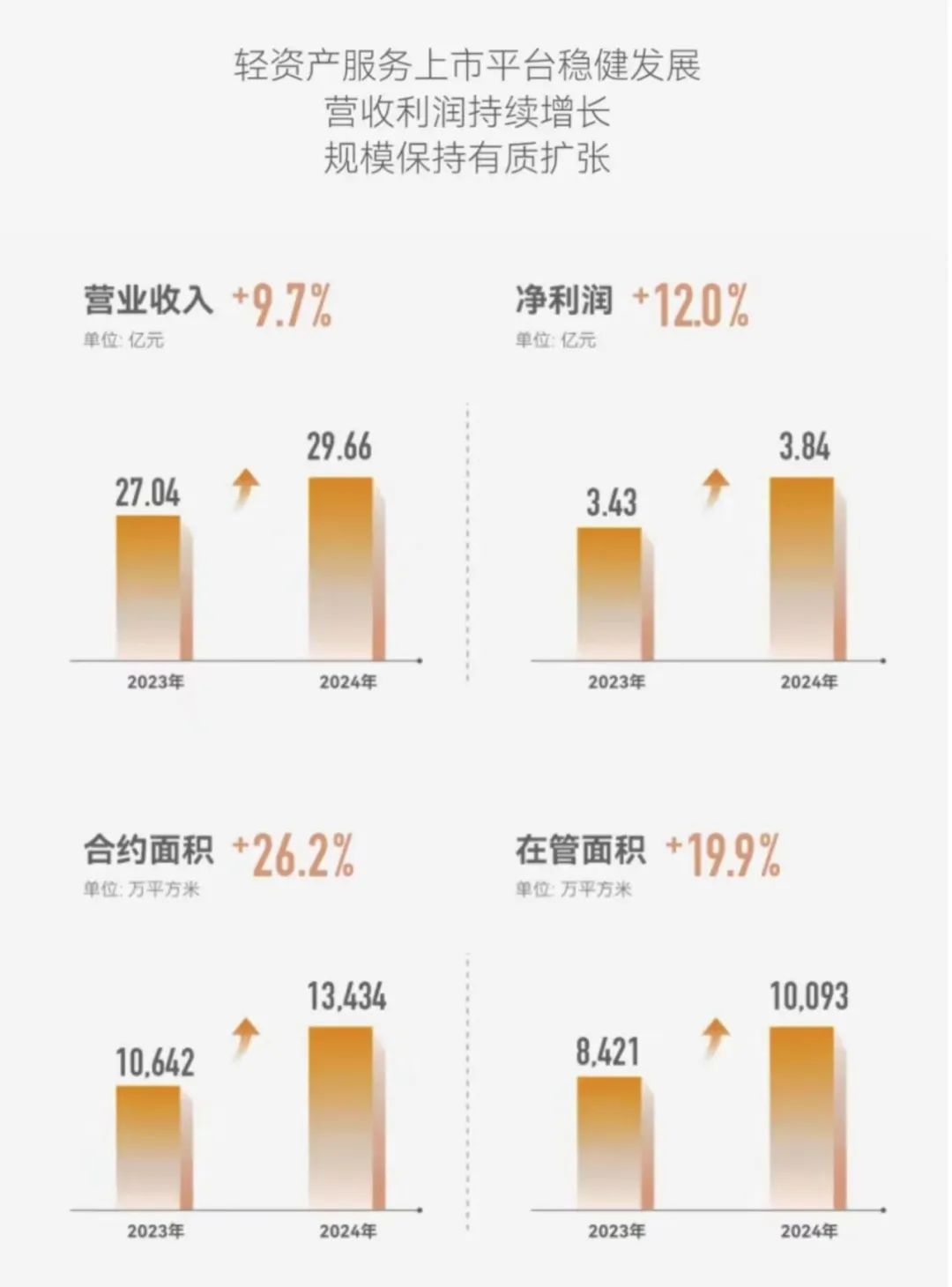 輕資產(chǎn)服務(wù)上市平臺(tái)方面,金茂服務(wù)2024年?duì)I業(yè)收入29.66億元,同比提升9.7%;合約面積13434萬(wàn)平方米,同比增長(zhǎng)26.2%;凈利潤(rùn)3.84億元,同比增長(zhǎng)12.0%,凈利率提升至12.9%。