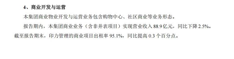 今年商業(yè)部分公布的數(shù)據(jù)內(nèi)容相對(duì)較少。其中,萬(wàn)科商業(yè)業(yè)務(wù)(含非并表項(xiàng)目)實(shí)現(xiàn)營(yíng)業(yè)收入88.9億元,較2023年的91.1億元同比略降2.5%。印力管理的商業(yè)項(xiàng)目出租率 95.1%,同比提高0.3個(gè)百分點(diǎn)。