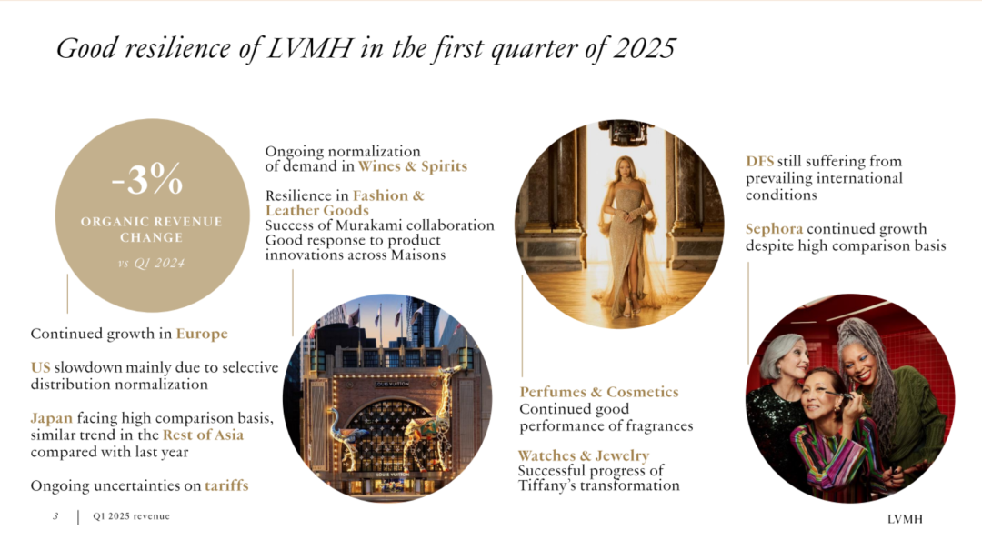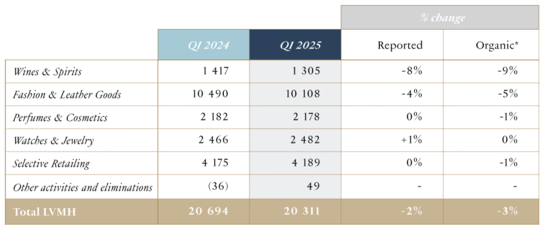 4月14日巴黎股市收盤后,LVMH集團發(fā)布了2025年Q1財報:其收入為203億歐元(約合人民幣1686億元),有機減少3%,低于市場預(yù)期2%的升幅。