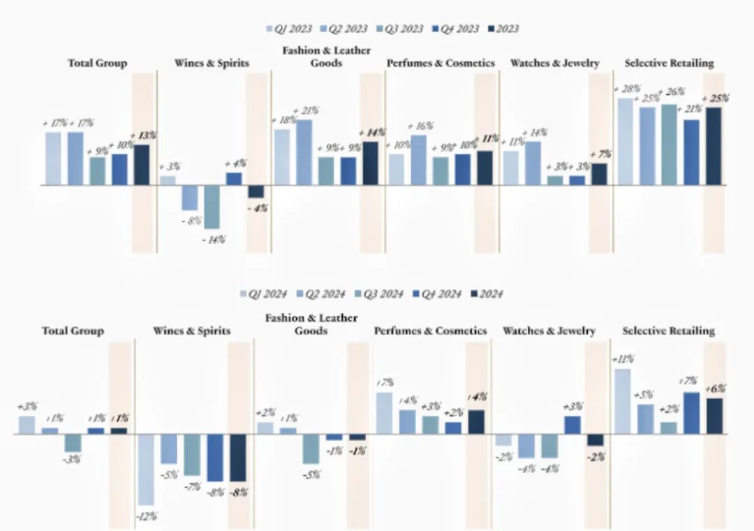 且對比兩年Q1來看,香水和化妝品部門在2023年、2024年Q1分別實現(xiàn)雙位數(shù)、高個位數(shù)的有機增長;同期,精品零售部門均實現(xiàn)雙位數(shù)的有機增長。