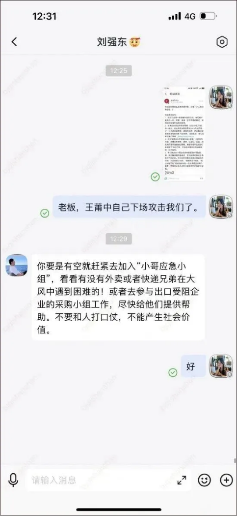 京東集團(tuán)新聞發(fā)言人齊珊珊在當(dāng)天中午發(fā)布了與劉強(qiáng)東的內(nèi)網(wǎng)對(duì)話。得知王莆中的發(fā)言后,劉強(qiáng)東一改往日的強(qiáng)勢(shì)風(fēng)格,只是云淡風(fēng)輕地回應(yīng)稱:“不要和人打口仗,不能產(chǎn)生社會(huì)價(jià)值!蓖瑫r(shí),劉強(qiáng)東強(qiáng)調(diào),要是有空就趕緊去加入“小哥應(yīng)急小組”,看看有沒(méi)有外賣或者快遞兄弟在大風(fēng)中遇到困難的!或者去參與出口受阻企業(yè)的采購(gòu)小組工作,盡快給他們提供幫助。