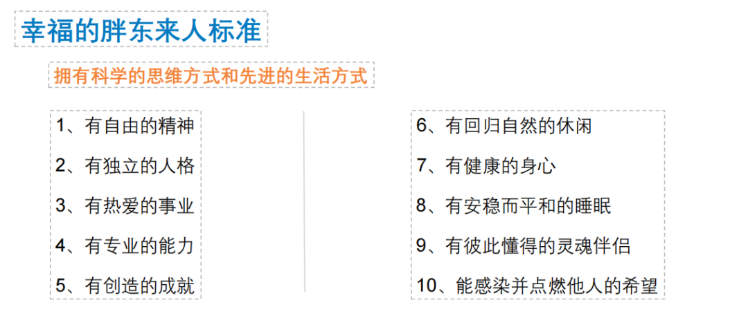胖東來(lái)的《幸福生命狀態(tài)》培訓(xùn)手冊(cè)里列出了幸福胖東來(lái)人的標(biāo)準(zhǔn),如下: