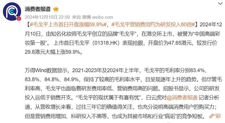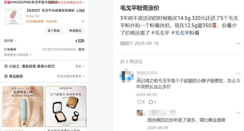 社媒平臺(tái)上有不少網(wǎng)友吐槽毛戈平漲價(jià)快、產(chǎn)品貴。有網(wǎng)友發(fā)帖稱“上市后,毛戈平的價(jià)格也是跳上一個(gè)臺(tái)階”,還有網(wǎng)友表示某產(chǎn)品“份量少了價(jià)格還高了”。