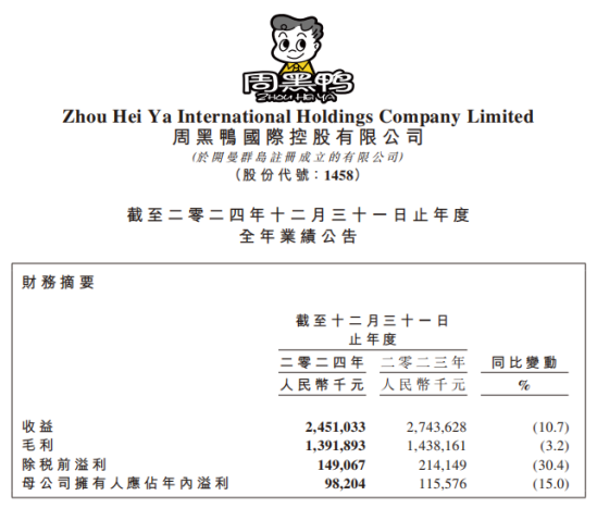 近期,周黑鴨發(fā)布的2024年財報顯示,2024年周黑鴨總收益從2023年的27.44億元下降至24.51億元,同比下降10.7%。2024年凈利潤從2023年的1.16億元下降至0.98億元,同比下降15%。