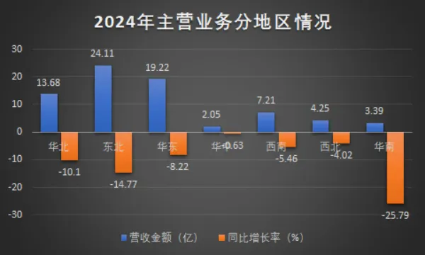2024年,公司于華北、東北、華東、華中、西南、西北、華南實現(xiàn)營收分別為13.68億、24.11億、19.22億、2.05億、7.21億、4.25億、3.39億,分別同比增長-10.10%、-14.77%、-8.22%、-0.63%、-5.46%、-4.02%、-25.79%,清一色下滑。