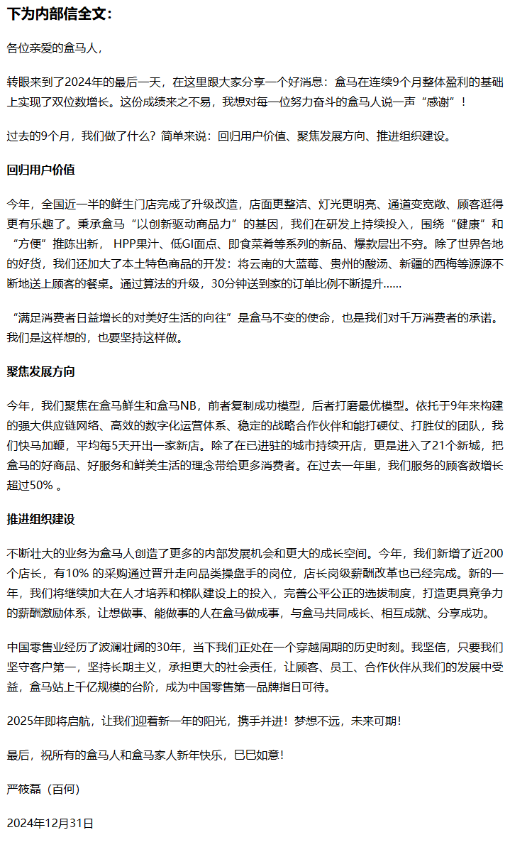 盒馬新CEO嚴(yán)筱磊發(fā)布的內(nèi)部信