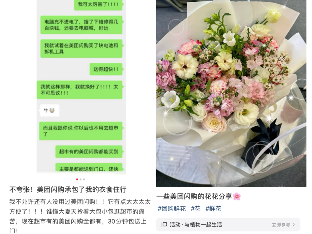 有網(wǎng)友靠美團(tuán)閃購買日常所需,有網(wǎng)友用美團(tuán)閃購挑選新鮮蔬菜,亦有人在美團(tuán)閃購尋找浪漫。如果在社交媒體搜索閃購買花,能看見不少網(wǎng)友曬出自己在美團(tuán)閃購下單的鮮花,有的是為悅己,有的則是傳達(dá)情誼;還有網(wǎng)友憑借美團(tuán)閃購,體驗(yàn)到足不出戶買3C數(shù)碼和家電產(chǎn)品的樂趣……