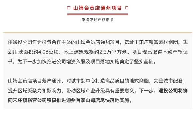 4月17日,通州投資發(fā)展公眾號(hào)發(fā)文稱,由通投公司作為投資合作主體的山姆會(huì)員店通州項(xiàng)目,選址于宋莊鎮(zhèn)富豪村組團(tuán),規(guī)劃用地面積約4.06公頃,地上建筑規(guī)模約2.3萬平方米。項(xiàng)目現(xiàn)已取得不動(dòng)產(chǎn)權(quán)證書,為下一步加快推進(jìn)公司增資入股及項(xiàng)目落地實(shí)施奠定了堅(jiān)實(shí)基礎(chǔ)。