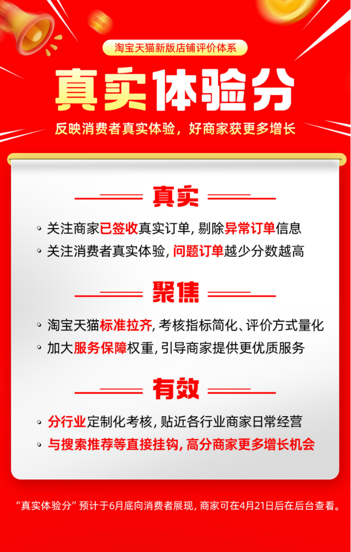 更重要的是,近期淘寶又對虛假評分開刀,通過推出全新的“真實體驗分”幫助好商家不斷跑出來。4月中旬,淘寶天貓發(fā)布“關(guān)于新增《淘寶平臺店鋪真實體驗分規(guī)范》的意見征集”,宣布即將上線新版店鋪評價體系“真實體驗分”。在公告中,淘寶天貓表示,要建立一個能真實反映店鋪口碑和消費者體驗的評價體系。
