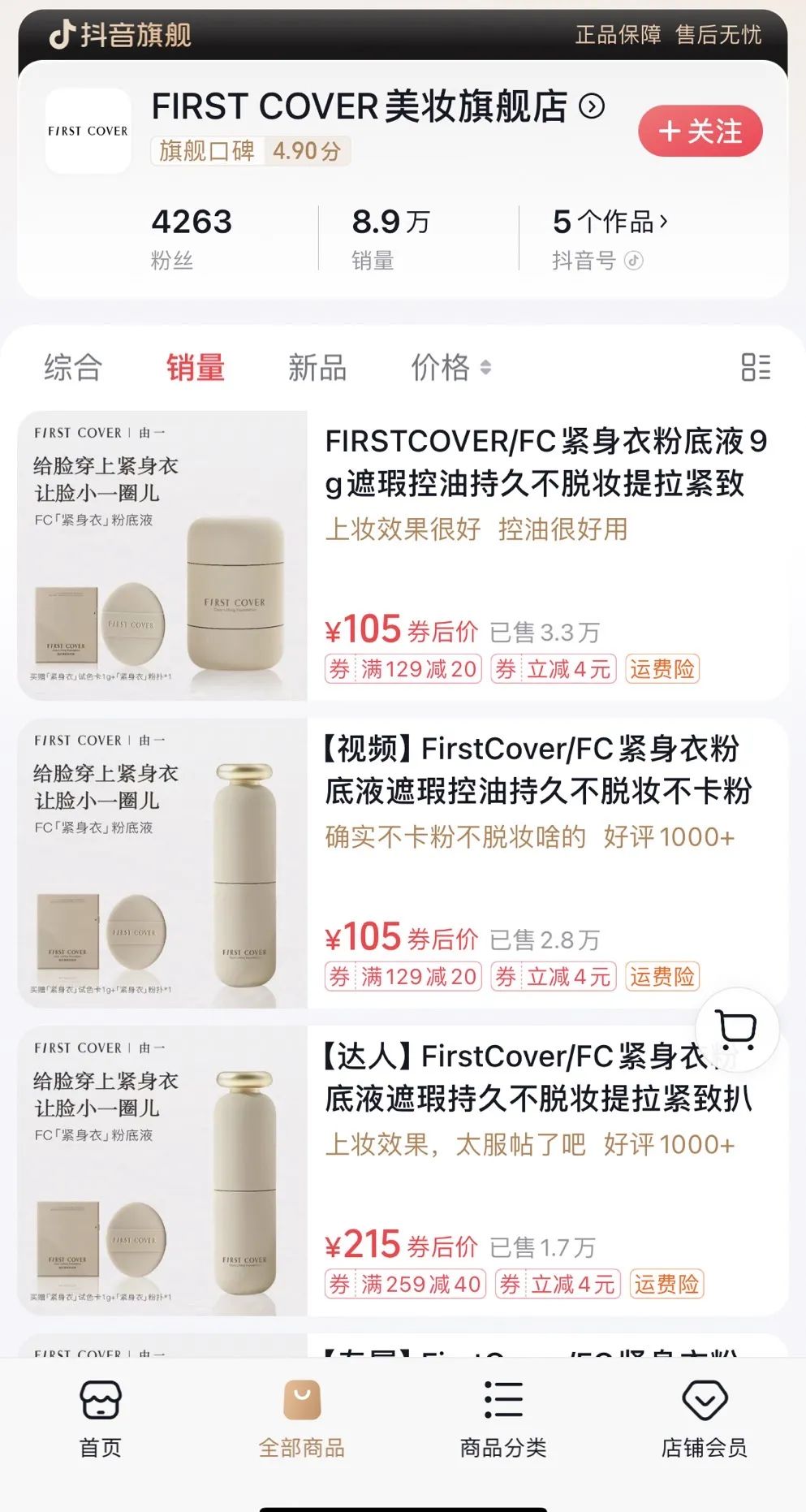 此外,由一品牌抖音旗艦店有超4000粉絲,該店鋪產(chǎn)品總銷量為8.9萬件,其中,銷量最高的“提拉緊致粉底液”(即品牌“緊身衣”粉底液產(chǎn)品)產(chǎn)品顯示已售出3.3萬。