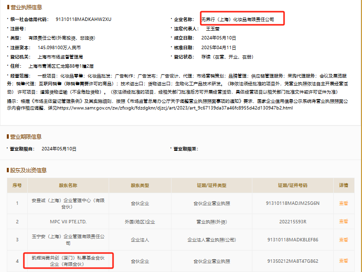 近日,青眼獲悉,由一品牌母公司無界行(上海)化妝品有限責任公司新增天使輪融資,投資方為凱輝消費共創(chuàng)基金。不過,融資金額未披露。