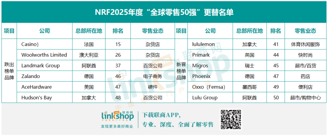 4月17日,美國(guó)零售聯(lián)合會(huì)(NRF)公布2025年全球前50名零售商名單,該榜單源于Kantar Retail數(shù)據(jù),根據(jù)2024年零售商的國(guó)內(nèi)和國(guó)際零售收入計(jì)算分?jǐn)?shù)進(jìn)行排名,上榜的公司要在至少三個(gè)國(guó)家和地區(qū)進(jìn)行直接投資。