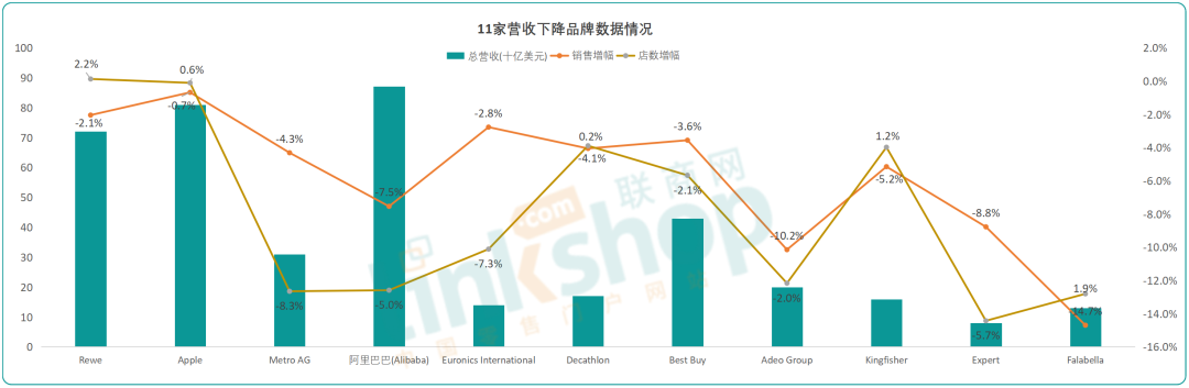 (3)44家企業(yè)中,有11個(gè)營(yíng)收下降,占比25%。其中Falabella營(yíng)收下降14.7%,安達(dá)屋集團(tuán)(Adeo Group)營(yíng)收下降10.2%,Expert營(yíng)收下降8.8%,跌幅略大。