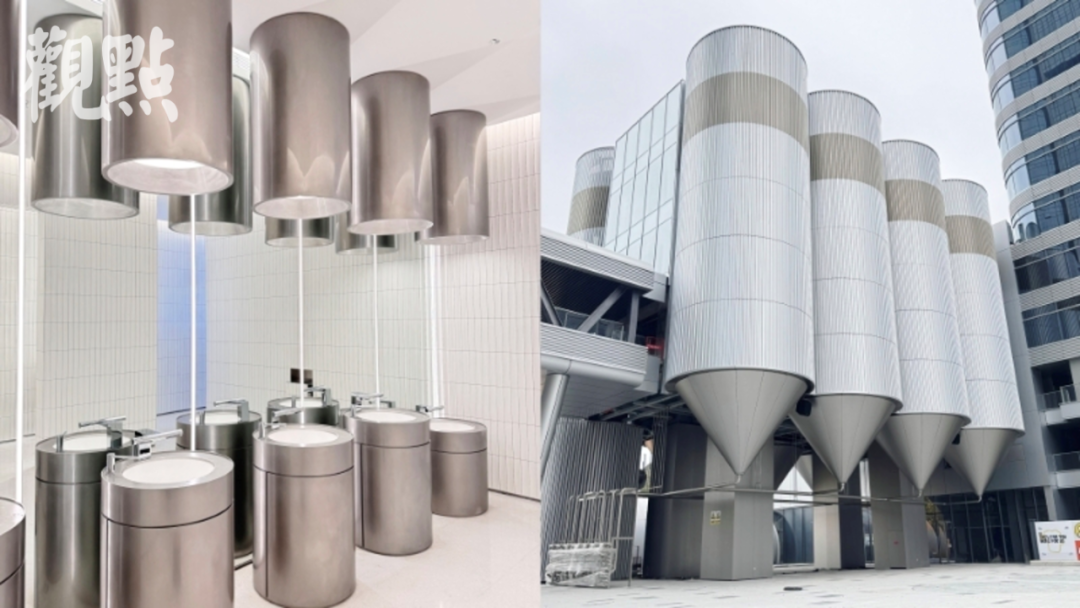 小鎮(zhèn)內(nèi),啤酒元素隨處可見。冒著白色氣泡的巨型啤酒瓶,坐在屋檐上的啤酒玩偶,蜿蜒爬行的啤酒管道,甚至細(xì)節(jié)到電梯的酒瓶指示燈、酒桶造型的垃圾桶、廁所的洗手池、啤酒管道式的空調(diào)通風(fēng)管等等。