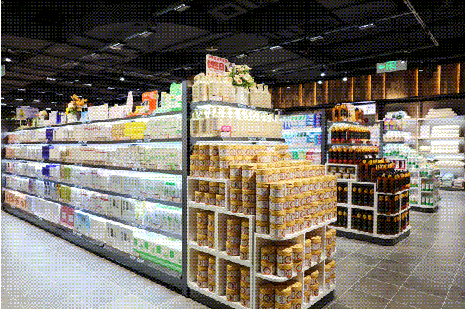 其中,賣場主通道寬度由原來的2.5米拓寬至4米,副通道拓寬至3米,同時也擴(kuò)寬了賣場的出入口;動線方面,取消了強(qiáng)制動線設(shè)計,采用開放式動線布局,顧客可根據(jù)需求隨意穿梭各個區(qū)域。如此一來,賣場布局更加清晰,動線更流暢,空間更加明亮通透,結(jié)合賣場裝修及美陳的升級,整個賣場環(huán)境更加凸顯品質(zhì),也極大提升了顧客的購物舒適度和便利性。