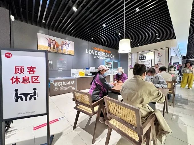 各門店便民服務(wù)區(qū)集齊身高測量儀、血壓儀、洗手池等設(shè)施,連卷袋旁配置濕手器,同時(shí)增設(shè)了寵物寄存處和母嬰室;在調(diào)料區(qū)配備放大鏡、果切標(biāo)注食用順序,提供四季免費(fèi)茶飲、打氧清洗服務(wù)。