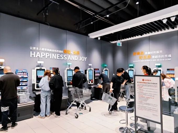 福州愛琴海店采用“環(huán)形動(dòng)線+雙出入口”設(shè)計(jì),兼顧綜合體客流與社區(qū)居民需求,深灰色天花板與聚焦射燈營造精品買手店質(zhì)感,拓寬至1.8米的通道提升購物從容感;北京凱德MALL?大興店取消強(qiáng)制動(dòng)線,降低貨架高度至1.6米,增設(shè)便民服務(wù)區(qū)與顧客休息區(qū),破解熟食烘焙區(qū)擁堵痛點(diǎn);成都新都匯融廣場店以開放式布局取代堆頭陳列,貨架橫平豎直、通道寬敞,搭配清晰分類標(biāo)識,提升購物效率。