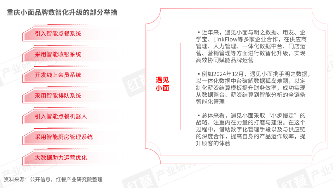 通常情況下,重慶小面品牌會通過引入智能點餐系統(tǒng)、采用智能收銀系統(tǒng)、開發(fā)線上會員系統(tǒng)等舉措提升運營效率。此外,還有一些品牌正通過不斷探索新路徑,實現(xiàn)原料采購、門店運營、企業(yè)管理等全場景的融合。例如遇見小面通過與多家企業(yè)合作,借助數(shù)智化手段,實現(xiàn)品牌內(nèi)部的高效協(xié)同。