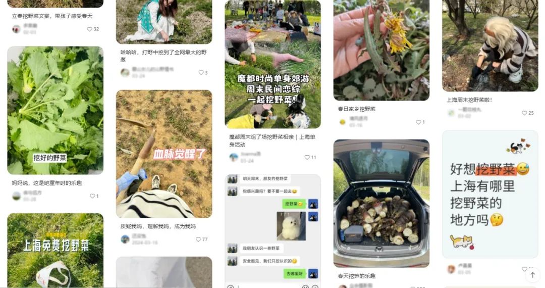 誰能想到,曾經(jīng)被視作“老年人專屬”的挖野菜,如今成了都市青年的新寵。打開小紅書搜索“挖野菜”,滿屏都是年輕人曬出的“戰(zhàn)利品”,有人驅(qū)車兩小時就為找一片野菜地,有人對著手機教程現(xiàn)學現(xiàn)挖,有人把挖來的野菜做成精致料理。還有人把挖野菜拍成vlog,配文寫著“今日打野戰(zhàn)績”,把田間地頭玩成了游戲副本。