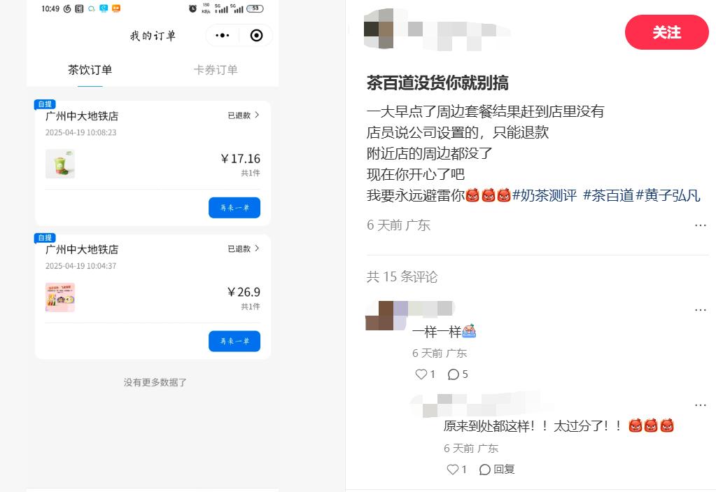 然而,目前仍有不少成毅粉絲不滿茶百道,認(rèn)為茶百道周邊物料準(zhǔn)備不足,甚至有店員散布更換代言人”的傳言。在茶百道與黃子弘凡的后續(xù)合作中,也有網(wǎng)友提到,上海某門(mén)店員工存在私吞黃子弘凡周邊的情況。