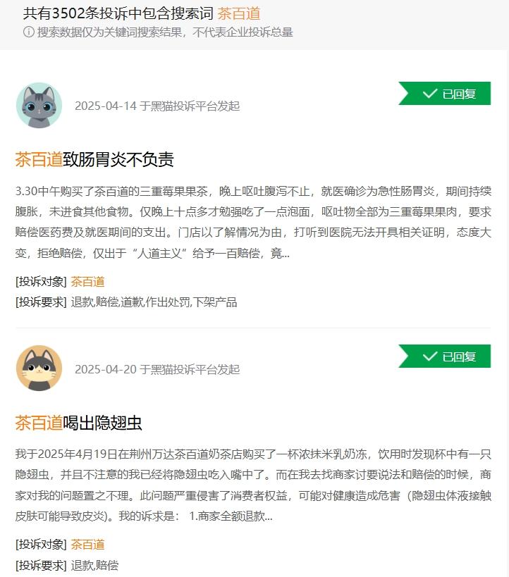 不過(guò),截至目前,社媒平臺(tái)上仍有消費(fèi)者陸續(xù)提到,在茶百道喝到了毛發(fā)、塑料碎片等異物,或是喝完茶百道后身體不適!昂谪埻对V”平臺(tái)顯示當(dāng)前有3500余條投訴包含搜索詞“茶百道”,其中近期有不少投訴直指食品安全問(wèn)題。