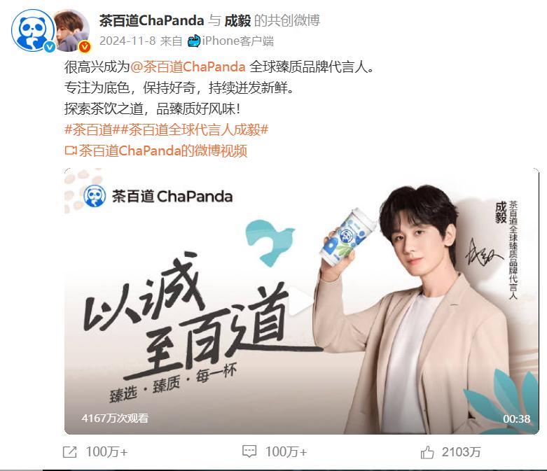 過(guò)去一年,茶百道還增加了與明星藝人合作的頻率。除了文俊輝、周翊然、楊舒予等限期飲品大使,去年下半年茶百道還官宣演員成毅為全球品牌代言人,購(gòu)買(mǎi)飲品即可獲得成毅貼紙、小卡、桌面立牌等周邊,吸引了不少粉絲搶購(gòu)。