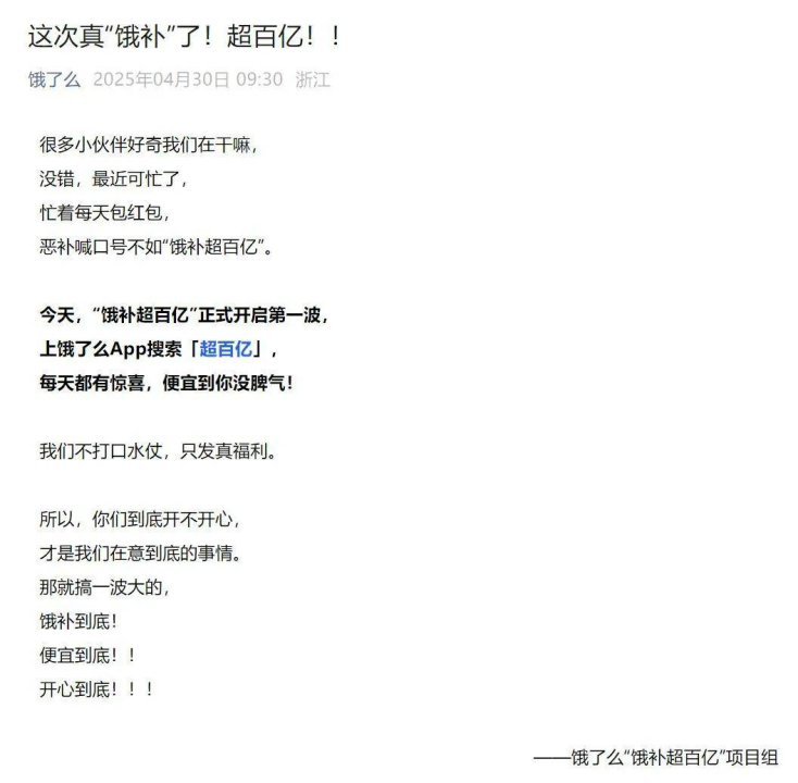 近日,餓了么官方公眾號發(fā)布消息,宣布“餓補(bǔ)超百億”正式開啟第一波。上餓了么App搜索「超百億」,用戶每天都能收獲驚喜,享受低價福利。餓了么表示“不打口水仗,只發(fā)真福利”,旨在讓消費者開心。這一舉措標(biāo)志著餓了么在百億補(bǔ)貼領(lǐng)域再次發(fā)力,也讓外賣行業(yè)的競爭愈發(fā)激烈,真正從“兩虎相爭”演變成了“三國殺”局面。