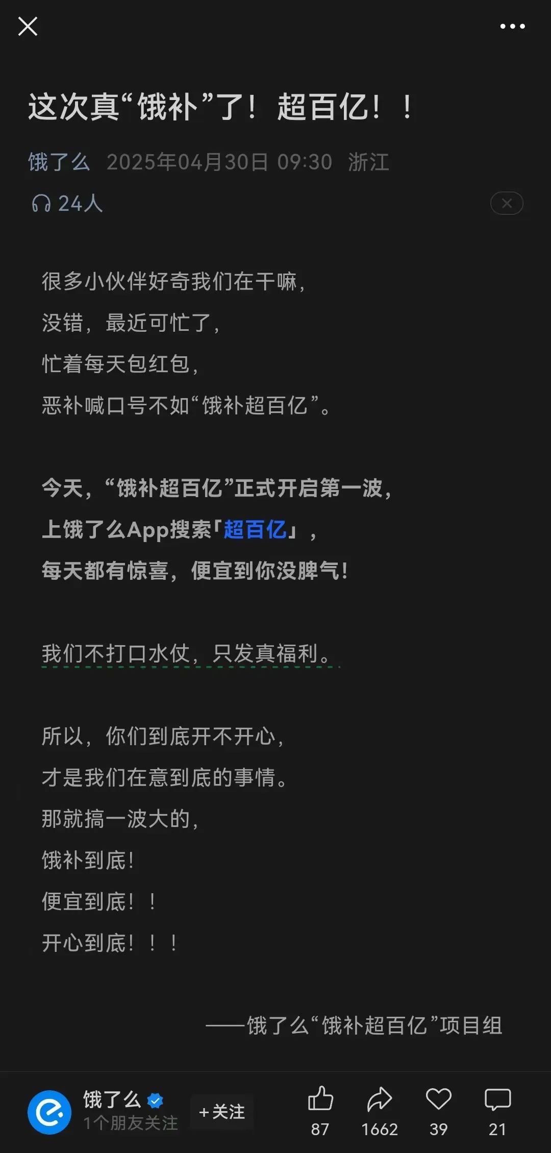 不僅如此,餓了么還在近日正式開(kāi)啟“餓補(bǔ)超百億”項(xiàng)目,實(shí)打?qū)嵔o用戶發(fā)福利。這一波操作,估計(jì)能為餓了么吸引不少用戶。