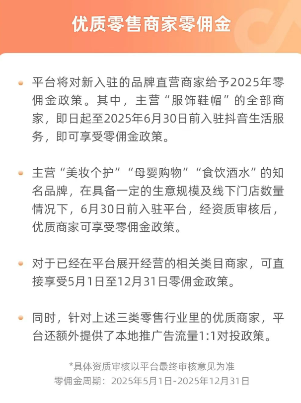 比如,平臺(tái)將對(duì)新入駐的品牌直營(yíng)商家給予2025年零傭金政策,服飾鞋帽類商家在2025年6月30日前入駐即可享受零傭金;