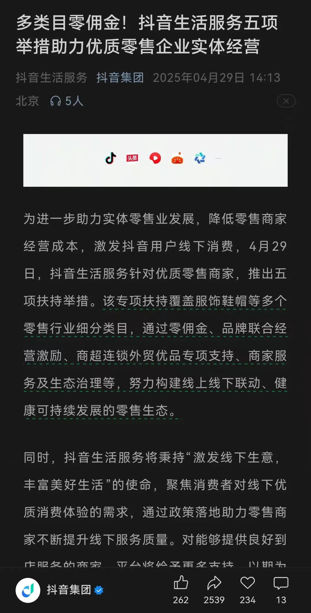 近日,為降低零售商家經(jīng)營(yíng)成本,激發(fā)抖音用戶線下消費(fèi)。抖音生活服務(wù)針對(duì)優(yōu)質(zhì)零售商家,推出五項(xiàng)扶持舉措,商家迎來(lái)一波發(fā)展的機(jī)會(huì)。