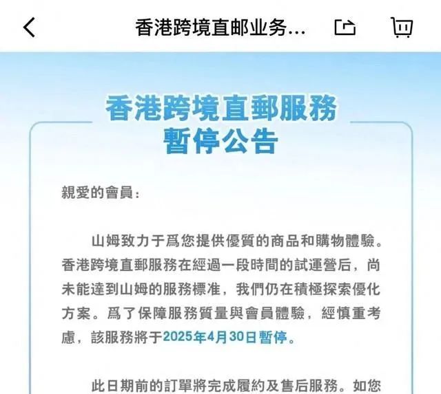 山姆公告顯示,香港跨境直郵服務在經(jīng)過一段時間的試運營后,尚未達到山姆的服務標準,經(jīng)過慎重考慮,該服務將于2025年4月30日暫停。